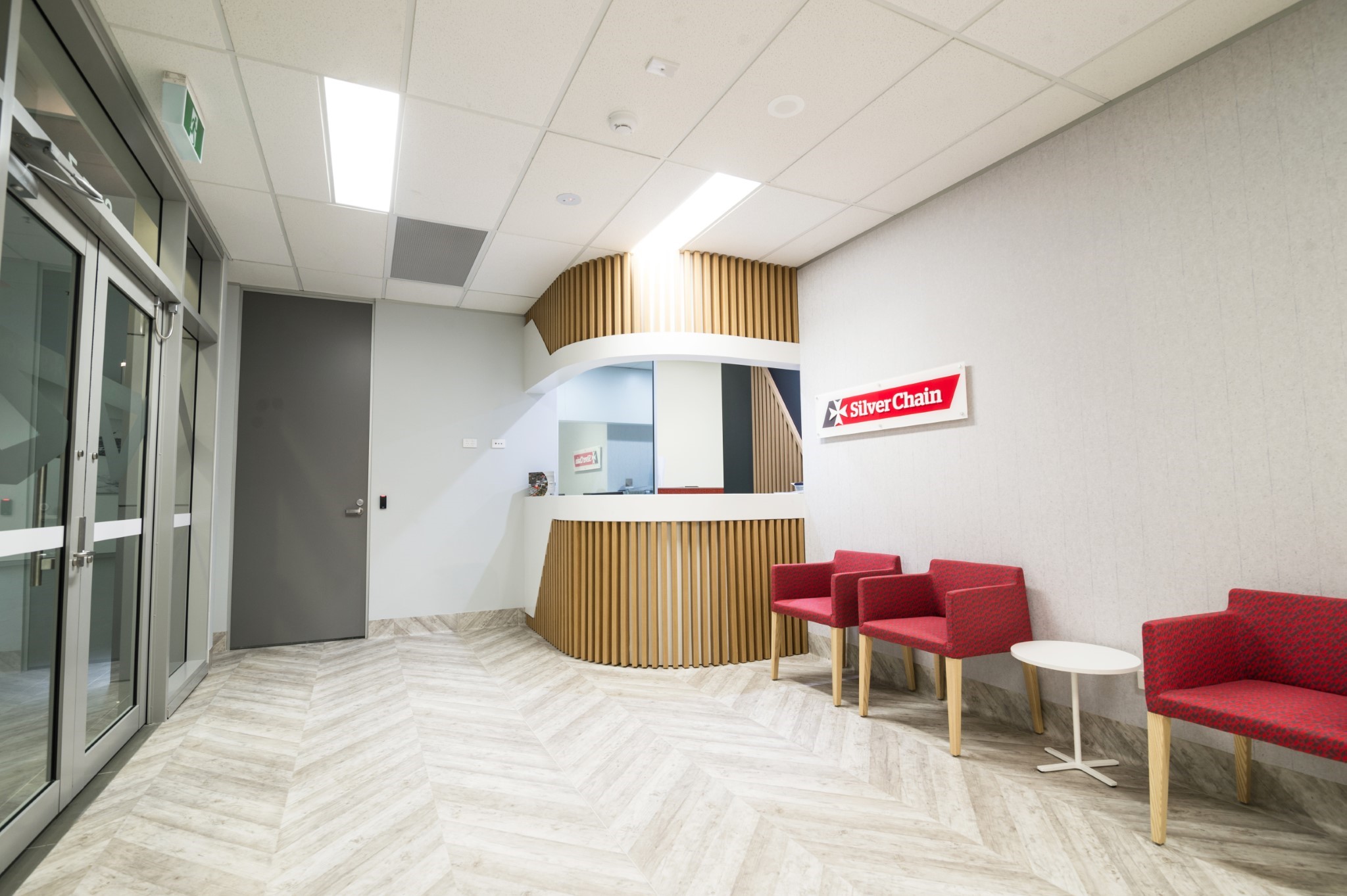 The large, curved reception is designed to be approachable and impactful, immediately accessible through the stairway and each waiting area. The reception is framed with the warm use of soft downlights and a timber finish framing the wall, allowing for ease of wayfinding and unique detailing.