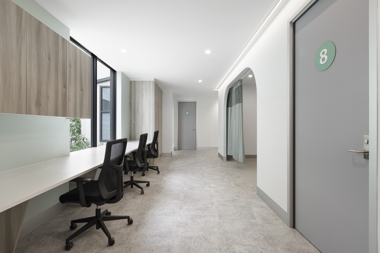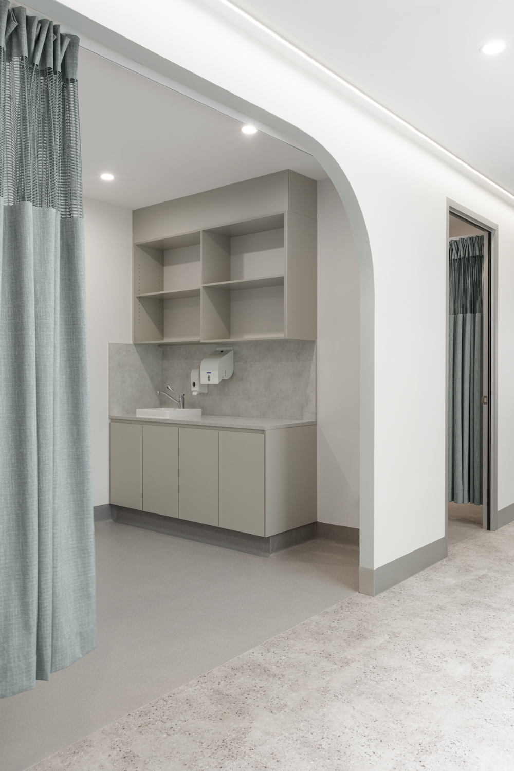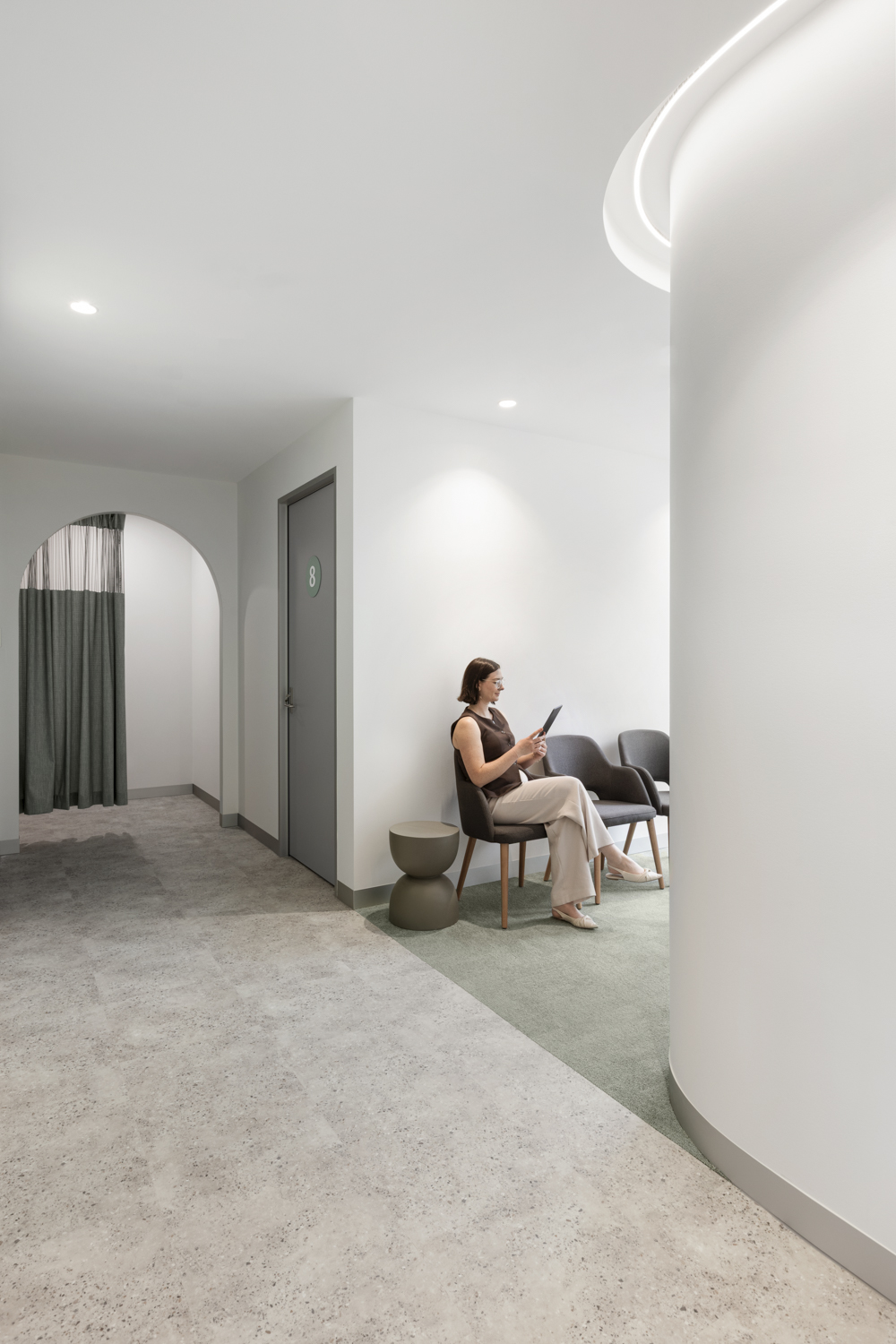 The interior vision reflects Laser Dermatology’s brand identity, with a signature teal colour thoughtfully integrated across patient, consult and treatment zones. Floor finishes, creative lighting and soft curved walls double as subtle wayfinding elements, intuitively guiding patients from reception and waiting areas through to consult and treatment rooms. High ceilings and generous natural light further enhance the refined, contemporary environment; creating a space that feels elevated rather than clinical.