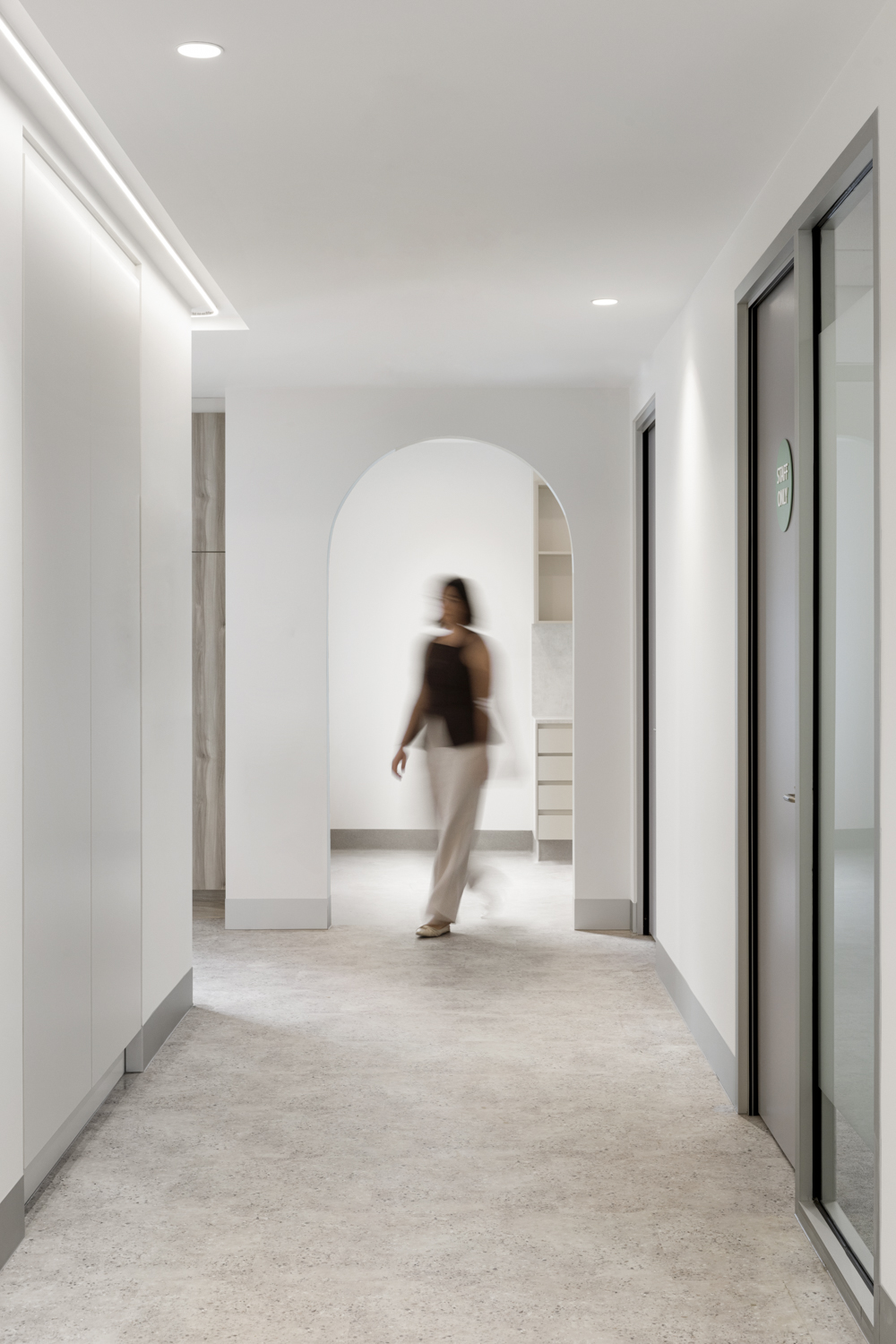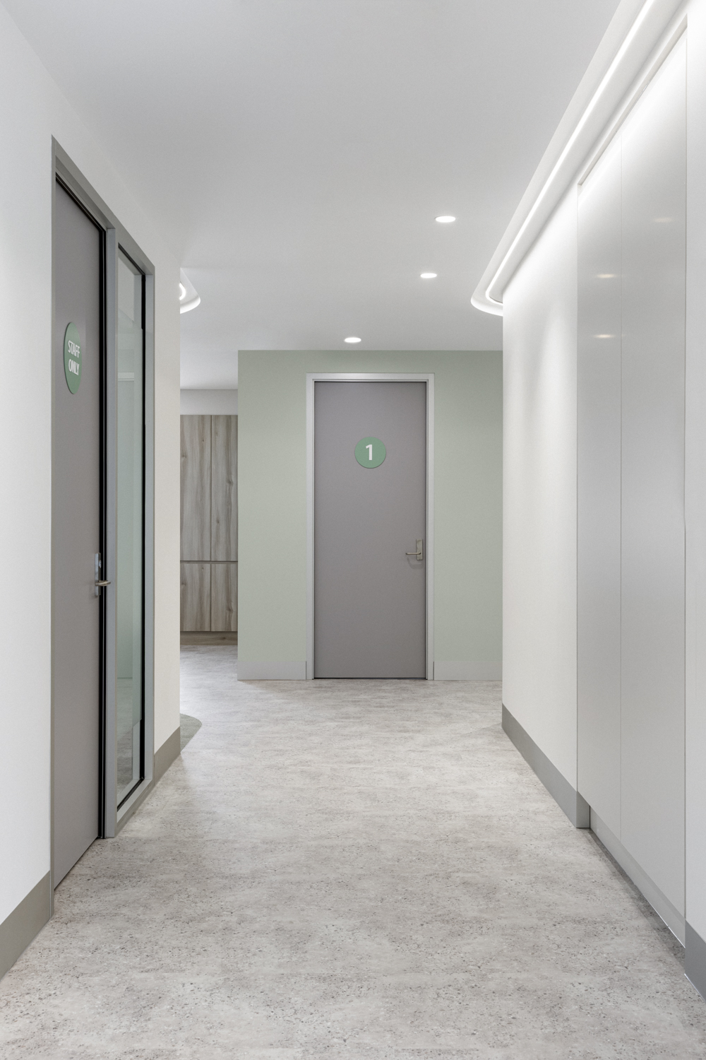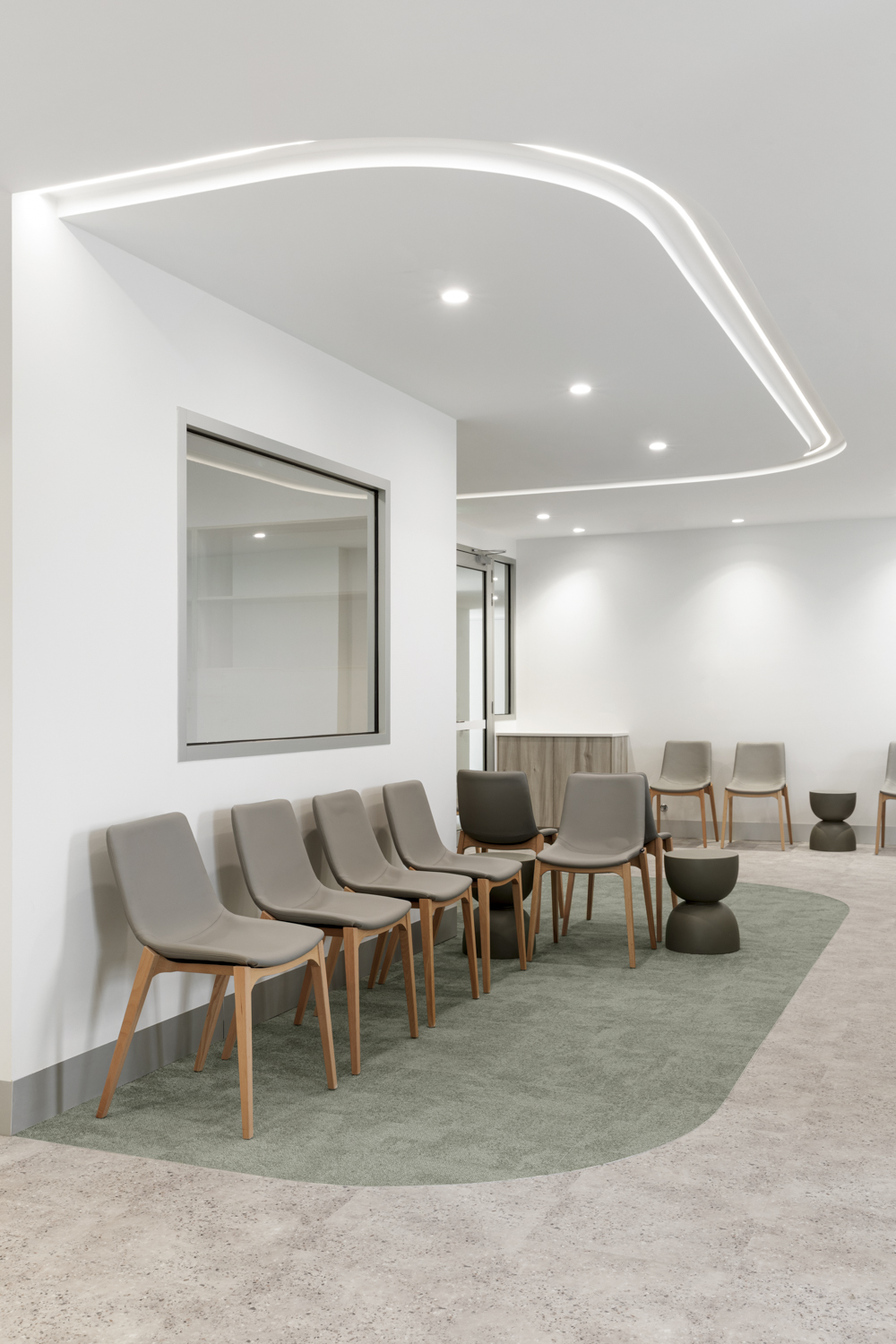 The interior vision reflects Laser Dermatology’s brand identity, with a signature teal colour thoughtfully integrated across patient, consult and treatment zones. Floor finishes, creative lighting and soft curved walls double as subtle wayfinding elements, intuitively guiding patients from reception and waiting areas through to consult and treatment rooms. High ceilings and generous natural light further enhance the refined, contemporary environment; creating a space that feels elevated rather than clinical.