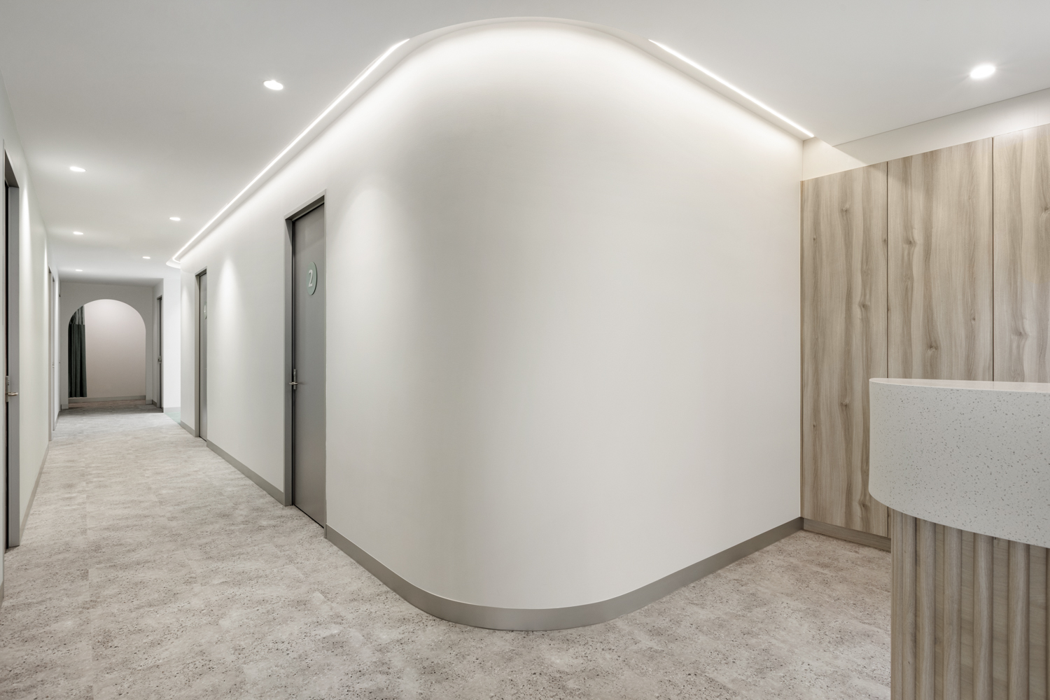 Interite delivered a comprehensive design, project management and construction solution, transforming a 612m², two-level tenancy into a sophisticated specialist medical suite. Grounded in a deep understanding of dermatological workflows and compliance requirements, the layout strategically separates patient and back-of-house zones, with optimised circulation to support efficiency and discretion. The clinic includes multiple flexible consult and treatment rooms, dual reception areas to distinguish service streams, future-ready infrastructure for advanced laser technology, and procedure rooms designed and built to accommodate specialised equipment.