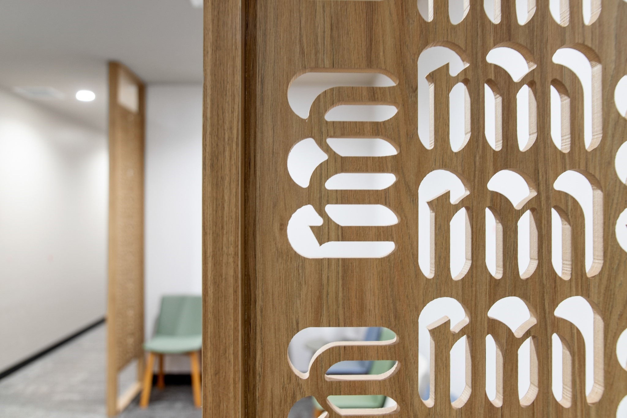 Custom joinery in natural tones in the reception zone is complimented by the curved ceiling that follows the lines of the reception counter in symmetry, with lighting working together both above and below to highlight the space and its features.