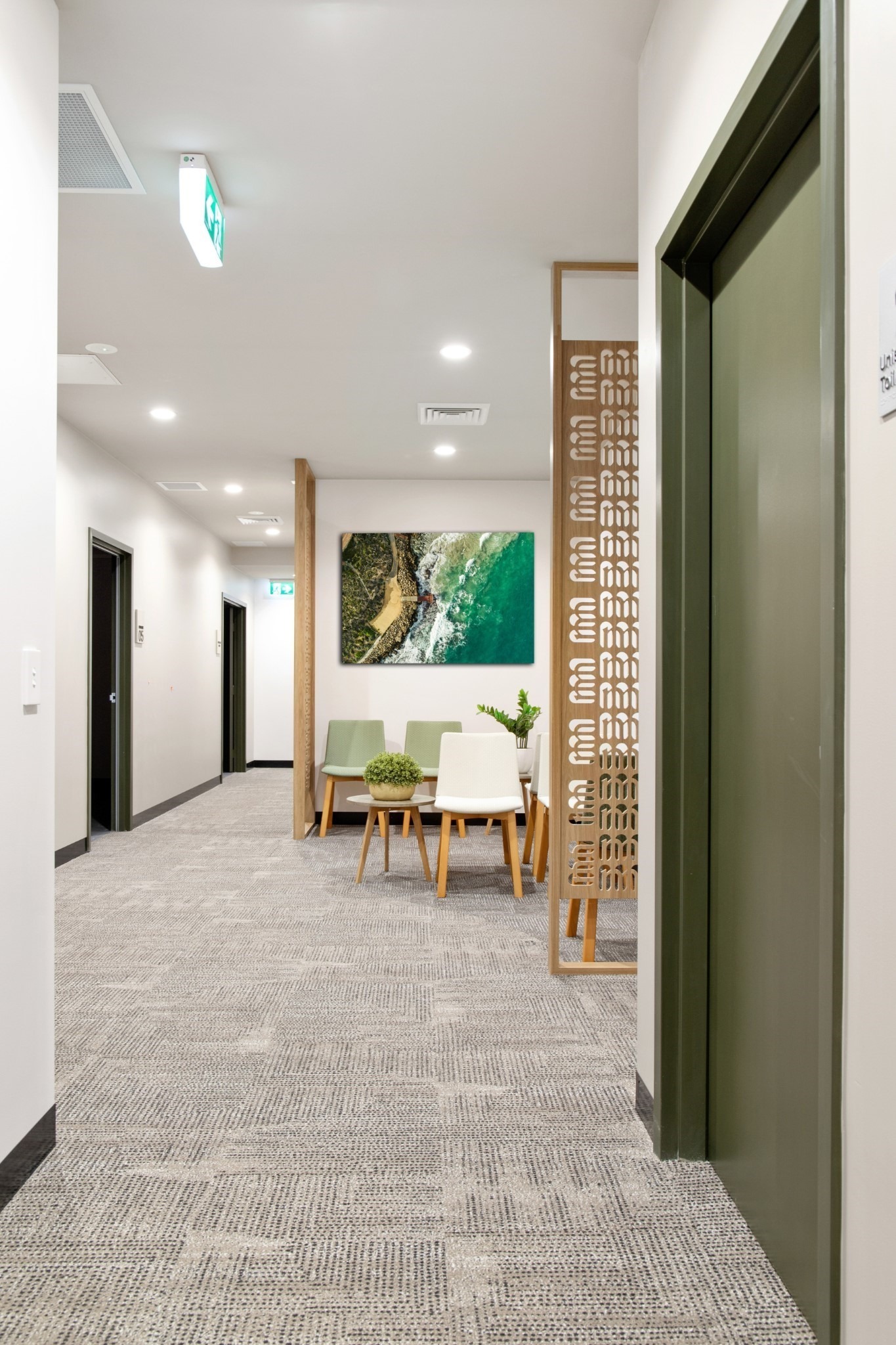 The L-shaped expansive passage provides the route for an impressive 10 consult rooms plus a nurse’s station and administration, compound, dispensary, pathology and lastly staff and patient amenities.