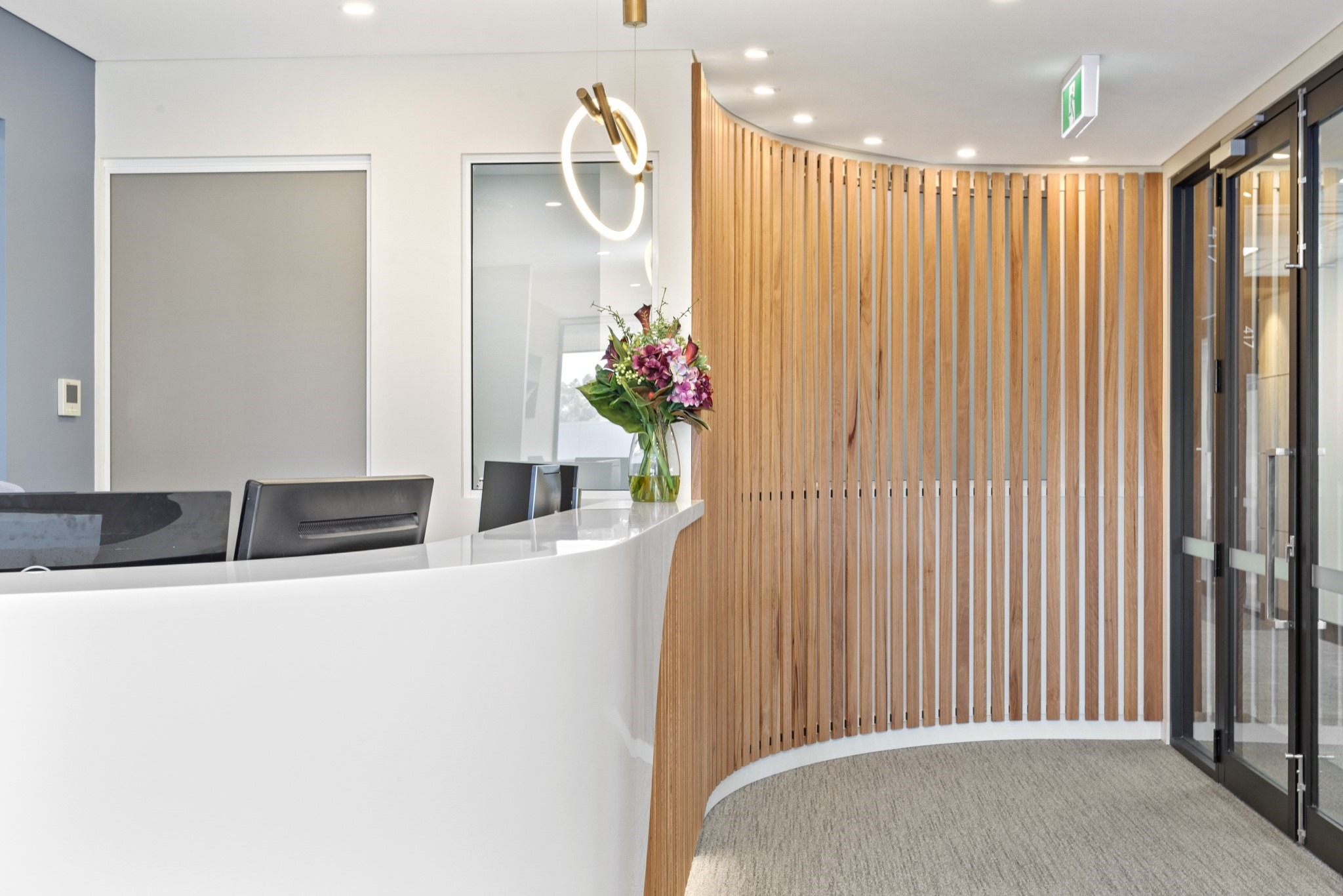 A small space does not need to impose on first impressions. Stunning warm natural timber joinery constructed with skill and care is highlighted with feature lighting; the main feature that captures your attention when you first enter the reception area at Specialist Orthopaedics, within Hollywood Medical Centre.